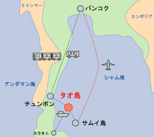 往路バンコクからタオ島への列車を利用した移動は、 ボートを乗り継ぐチュンポンの駅に深夜3時に到着するか、 もしくはチュンポンの街に1泊する必要があり、 乗り継ぎが悪く、遅延のためボートに乗り継ぐことができない事も多々あるため、日程に余裕がない場合はお勧めできません。